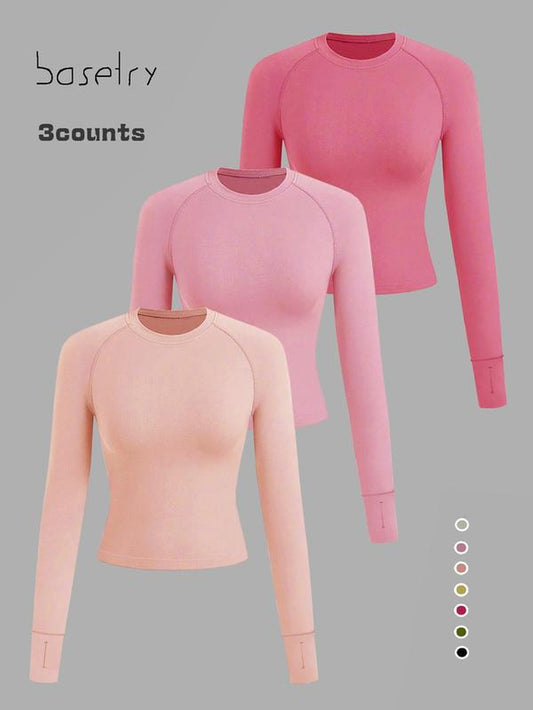 Women'S Solid Raglan Sleeve Thumb Hole Design Sports Tee, Breathable Comfortable round Neck Long Sleeve T-Shirt for Yoga Gym Workout, Ladies Activewear Sportswear for Fall & Winter, Athletic Workout Tops