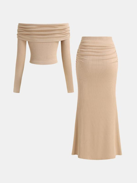 YOZY Women'S Solid off Shoulder Ruched Top & Mermaid Skirt Two-Piece Set, Elegant Fashion Casual Two Piece Outfits for Daily Outdoor Wear, Ladies Clothes for All Seasons